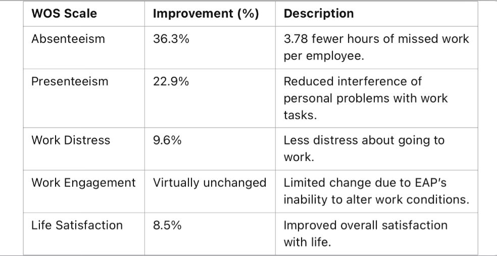 The results of the study revealed significant improvements in absenteeism, presenteeism, and work distress, along with a modest increase in life satisfaction. These findings suggest that Employee Assistance Programs (EAPs) can play a crucial role in enhancing key workplace outcomes.