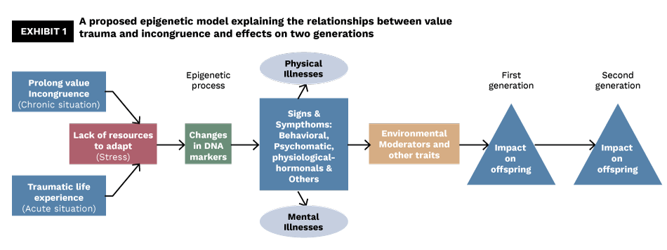 Let’s clarify this proposal further. Inheritance is typically associated with the Mendelian genetic laws of transmission of information from parents to offspring by alleles (DNA sequence). However, there are increasing empirical data suggesting that traits (and perhaps some that are value-driven) can be acquired from ancestors by mechanisms that do not imply genetic alleles, referred to as non-genetic inheritance. Information that is not genetically transmitted through the generations includes the traumatic experience of parents and long-term exposure to certain environments (i.e., living within a context of incongruence between important values) that could have effects on parental cell mutations and polymorphisms.