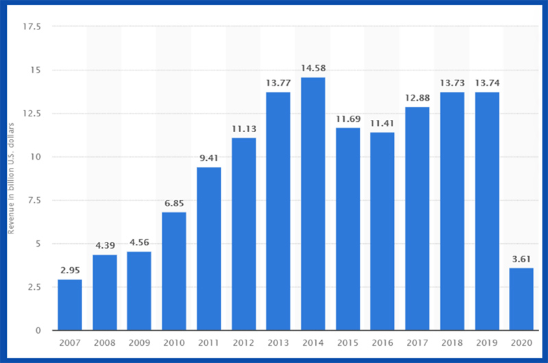 It has the 909th rank and a market cap of $20.97 B. Their price for a share is $42.77, and they operate in the USA. In 2019, their revenue reached $12.46 B, and this number went down to $4.91 B last year. This year, they’ve already lost $2.17B, which looks terrible compared to 2019’s earnings of $3.69 B.