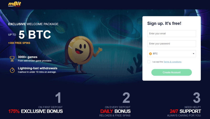 mBit offers its players a great welcome package – 175% off up to 5BTC along with 300 Free Spins. Moreover, users can enjoy daily bonuses, cashback on losses, and VIP bonuses.