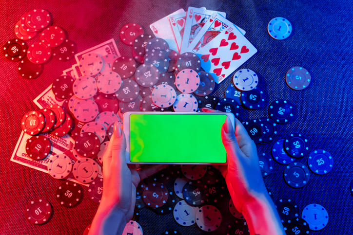 Playing cards, betting Chips and a smartphone with a copy space in women's hands