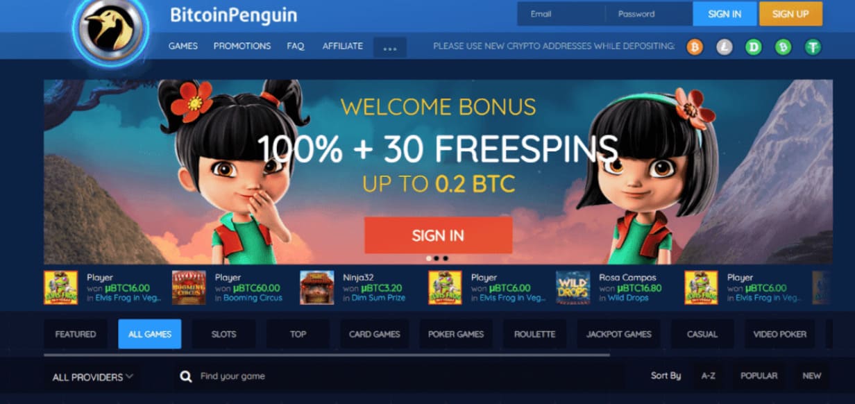 Bitcoin Penguin is a huge online casino that accepts different types of cryptocurrencies. It provides users with a wide range of deposit and withdrawal methods. Plus, each transaction is safe and fast.