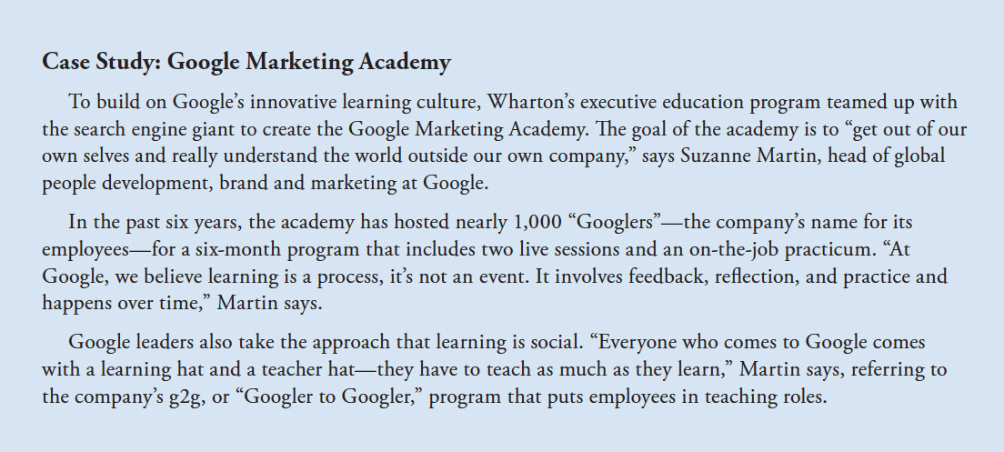 Creating learning experiences in the classroom and on the job must give learners a chance to let down their guard and actively engage in learning. Among executives, there is a subtle, often unspoken sentiment that they have a lot more to lose if they show that they still have things to learn. At Wharton’s Aresty Institute of Executive Education, when we get a group of senior executives in a classroom of peers, their image and self-importance often accompany them into the room. Perhaps the popularity of massive open online courses (MOOCs) is driven partly by the reluctance of many adults to reveal just how much they don’t know. While it might be convenient to learn away from peers—and it reduces initial awkwardness—MOOCs do not capitalize on the richness of learning from others and of reflecting on your unique approach to leading. A well-designed online program includes interaction among teams, small groups, and faculty.