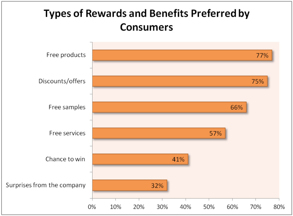 - Free products or gifts. 77% of consumers say they like free products as a reward for their loyalty. So why not surprise customers with a free gift just for being a customer?