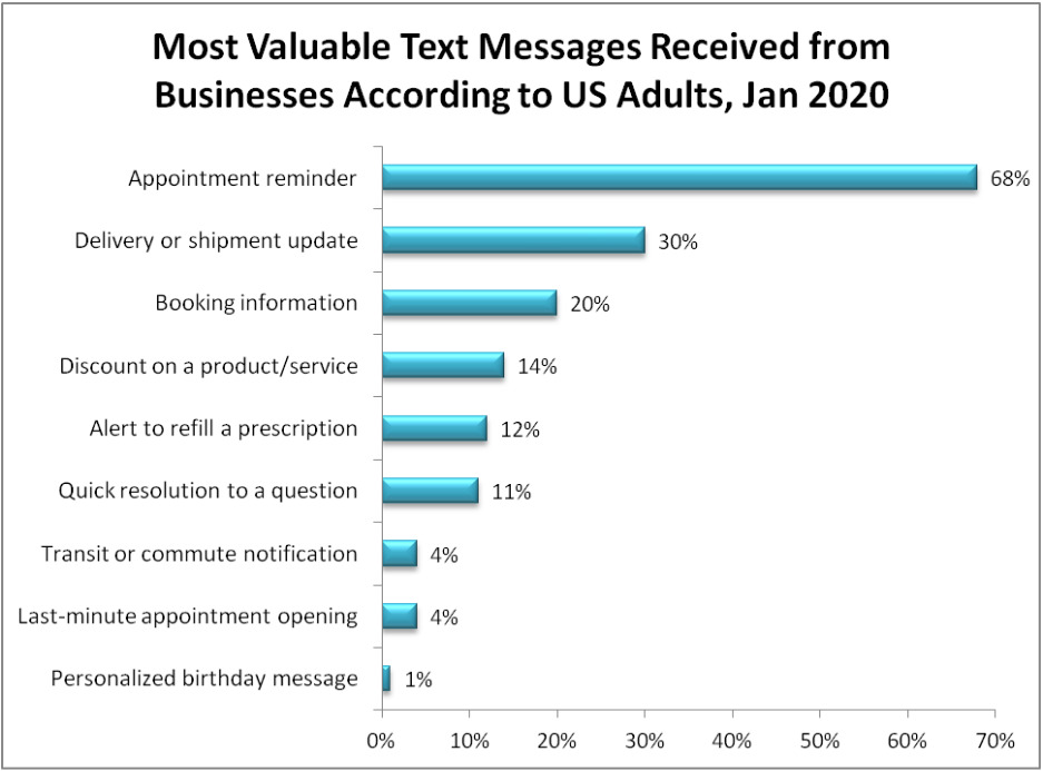 - Provide value to customers. 68% of US adults find appointment reminders valuable, while just 14% value discounts. So focus on transactional messages that give real value to customers.