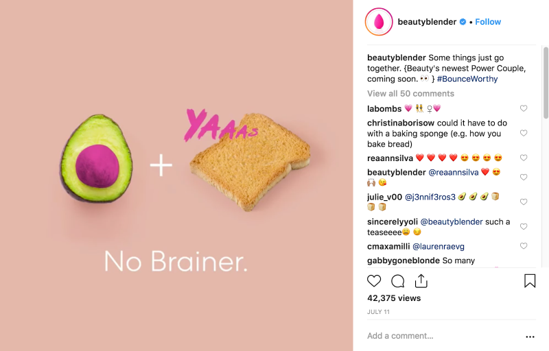 The example below shows a creative ad from Beauty Blender teasing their followers with their newest product:
