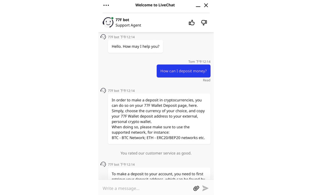 Should you need help with betting, the promos, or some of the games, 77F offers excellent customer service. The 24-hour customer service team can be reached via email and live chat, which are the most popular options for most players.