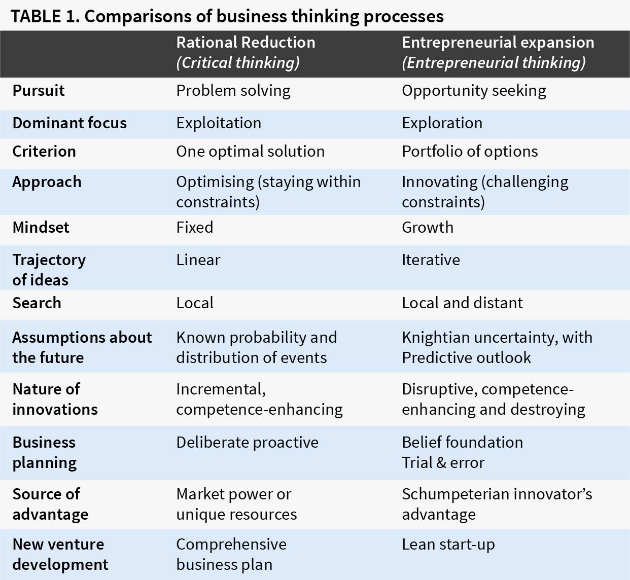 Foundational to rational reductionism is exploitation through problem solving. Critical thinking is more commonly engaged in addressing a defined problem. By contrast, entrepreneurial thinking is focused more on exploration through creating or discovering new, untapped opportunities available to the firm. In this sense, we have a divergence of thought approach right from the context-setting stage of the thinking process. (see table 1 below)