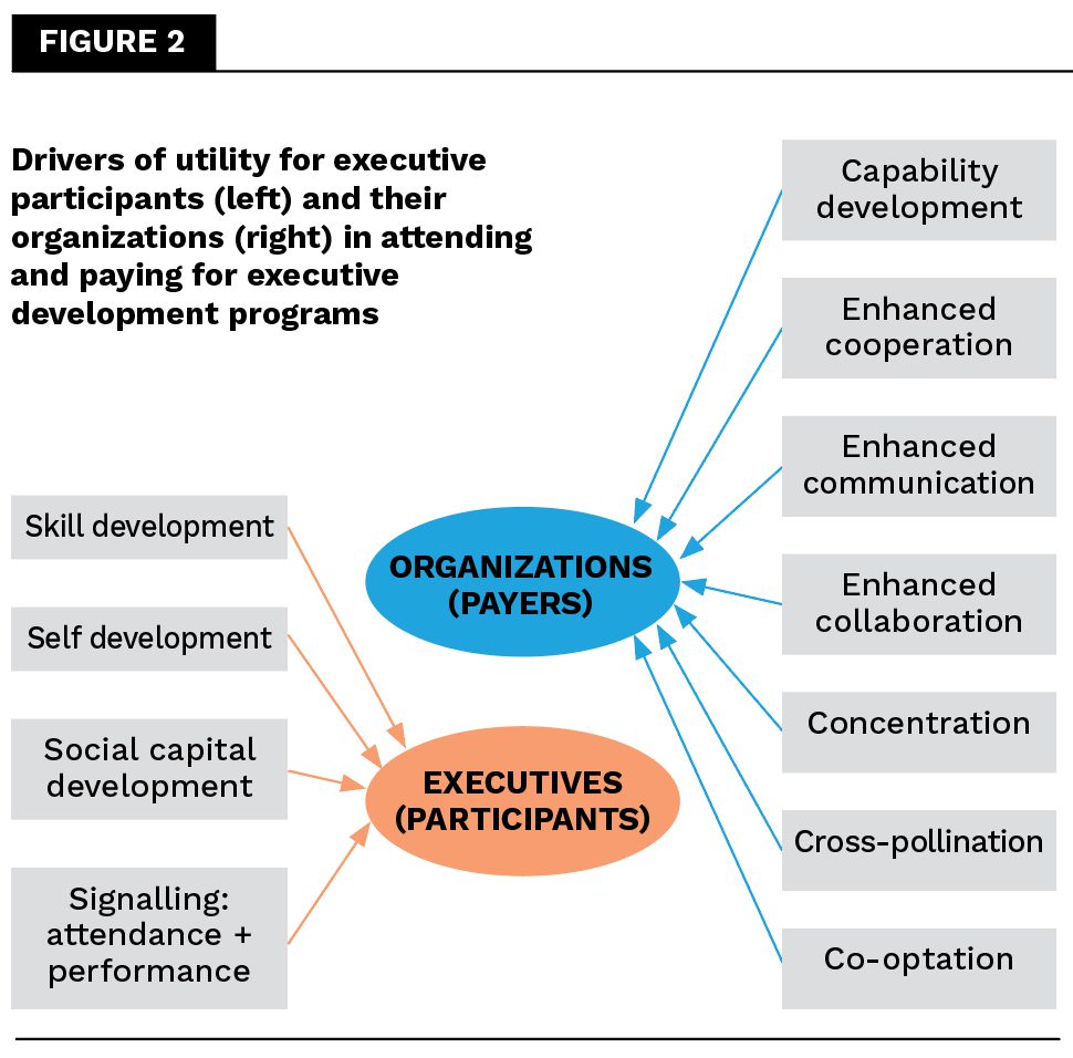 But, executives and organizations come together in one objective: the development of skills (executives) and capabilities (organizations) that are new, applicable and valuable to the executive and the organization. The result is intuitive. Its evident appeal can be illustrated by a thought experiment: Suppose leading providers of executive learning programs discovered the skills and capabilities they teach, develop, nurture, or otherwise impart to participants lack the value they are widely perceived to possess, whether because the content is outdated, the means by which skills are developed is no longer suited to participants’ modes of learning, or the skills are not applied in the organizational contexts in which they provide value. Suppose that, upon discovering this, these leading providers modified their marketing message to convey only the networking and signaling value of their programs – a message that would go like this: