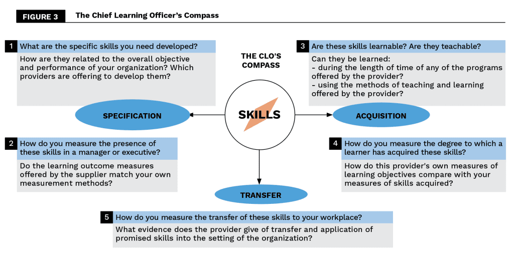 First, to contract with programs that shall help their executives develop useful skills, organizations have to specify these skills precisely. If you do not know where you wish to go, it does not matter what direction you take’. Just so, if a Chief Learning Officer cannot define the skills his or her executives need, it will not matter which provider or program he or she turns to. However, just as understanding machine learning is more than learning how to rattle off a few terms and names, learning and using a skill is much more than knowing a topic. To specify the skills their companies need, CLOs must look under the ‘subject hood’ of course offerings: beyond ‘topics’, to the skills instructors claim to help participants learn. But the task is not easy: Courses and learning experiences are described in terms of subjects and knowledge areas (‘financial accounting’, ‘Blockchain for financial services’, etc – forming what we call the ‘subject hood’) – which makes them opaque regarding the skills (eg.: ‘programming simple contracts in Ethereum and iOS; creating pro forma income statements and balance sheets in Excel’) that participants can hope to acquire and bring back with them. It is not enough for a CLO to ask: What new terms of art will our executives learn by participating in the program?, or, what new frameworks will they contribute to the conversational capital of the organization? The question CLOs should ask is rather: What do we need our executives to learn to do and will they learn that in this program? – and select programs on the basis of useful skill demonstrably developed – and not by ‘topic covered’. Thinking of an executive as a bundle of skills – rather than as a repository of domain-specific knowledge with certain traits, proclivities, and educational background – allows CLOs to figure out the skillset associated with role, and the relative value of different skills for that role.