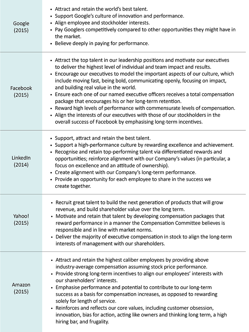Figure 5 demonstrates the main human resource policies of large companies such as Google, Facebook, LinkedIn, Yahoo, and Amazon. It is worth noting that some general principles are shared by most companies, such as alignment with the business strategy, pay for performance, recruitment and retention of the best talent, as well as external competitiveness.
