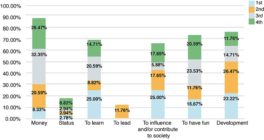 New generations give increasingly greater importance to the content of their work. In fact, money now ranks fifth as the main reason why millennials choose a job, behind metrics such as “to learn”, “to influence and/or contribute to society”, “development”, and “to have fun” (see Figure 3). However, money still occupies a position of capital importance since almost 90% of survey participants report it as one of their four main reasons for working, while less than 80% are interested in personal development. Our survey obtained results that confirm that millennials prefer challenging jobs that can help them advance in their careers. Therefore, it comes as no surprise that many of them opt for jobs at the smallest companies, where they believe they will be able to perform a more practical role and have a greater impact.