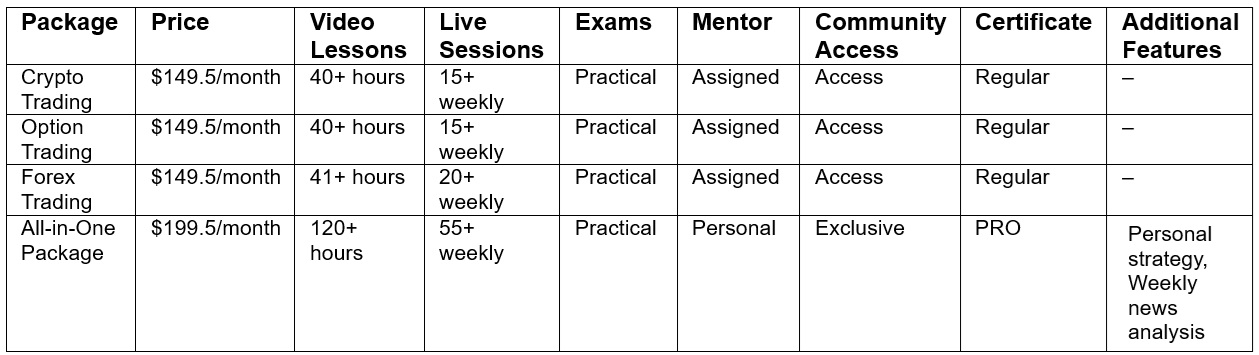 For those wanting a comprehensive trading education, this package combines crypto, options, and forex. Gain market knowledge, advanced strategies, risk management skills, and more.