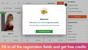 - Fill in all the fields and answer all the questions during the registration. You can skip almost all the steps, but if you don’t skip them, you’ll get 20 free credits and much more attention from the ladies on this dating site.
