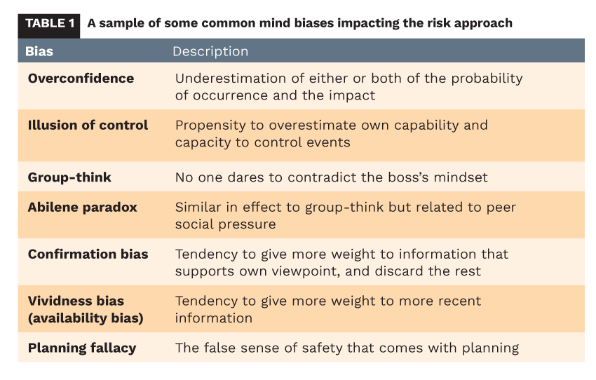 Mind biases are many and diverse. Although there are some 200 identified mind biases [2], some are more common and pervasive than others. To provide a sample, let’s look at Table 1. These are particularly common to those at the top of organisations.