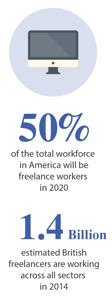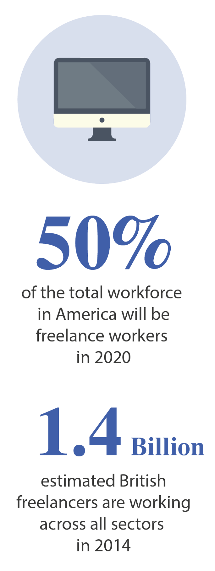 In recent decades, there has been an unprecedented rise in non-standard forms of work that include flex-time, on-loan, telecommuting, remote work, ‘occasional use flexibility’, job-sharing, and other novel ways of working. The trend towards “freelance work” – contract labour – in America was estimated in 2014 at 53 million, approximately 34 percent of the total workforce, which is expected to balloon to 50 percent by 2020 (Wald, 2014). Correspondingly, there are an estimated 1.4 million British freelancers working across all sectors, a number which has grown 14% in the past decade (Matthews, 2015). Not only bringing billions of freelance earnings to economies, these arrangements allow employees to structure their work time more flexibly and improve their family life, while also providing employees with a choice of location from which work is done.