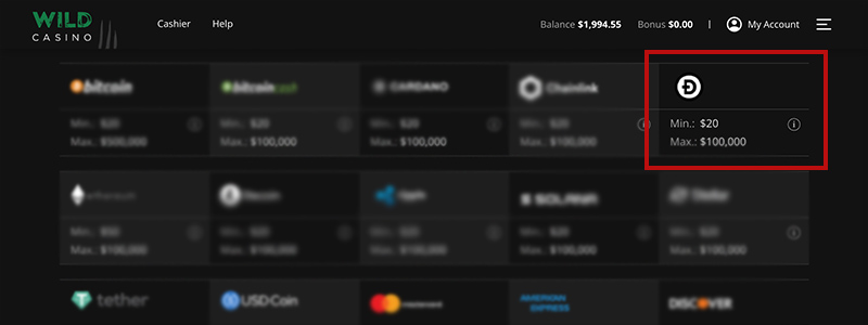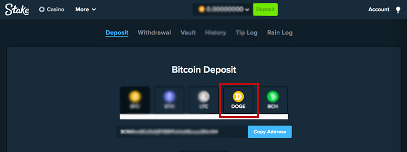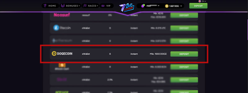 Simply log in to your casino account, select DOGE as your deposit method, and grab the QR code or Dogecoin wallet address of your casino account and send the funds there.
