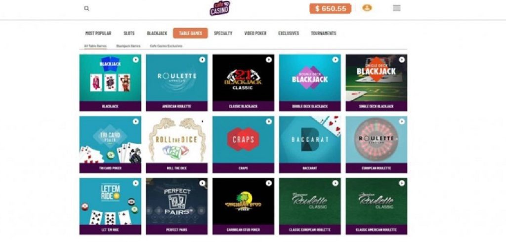 Cafe Casino offers a diverse game selection that caters to all types of players. In particular, their collection of table games is one of the most extensive available online.