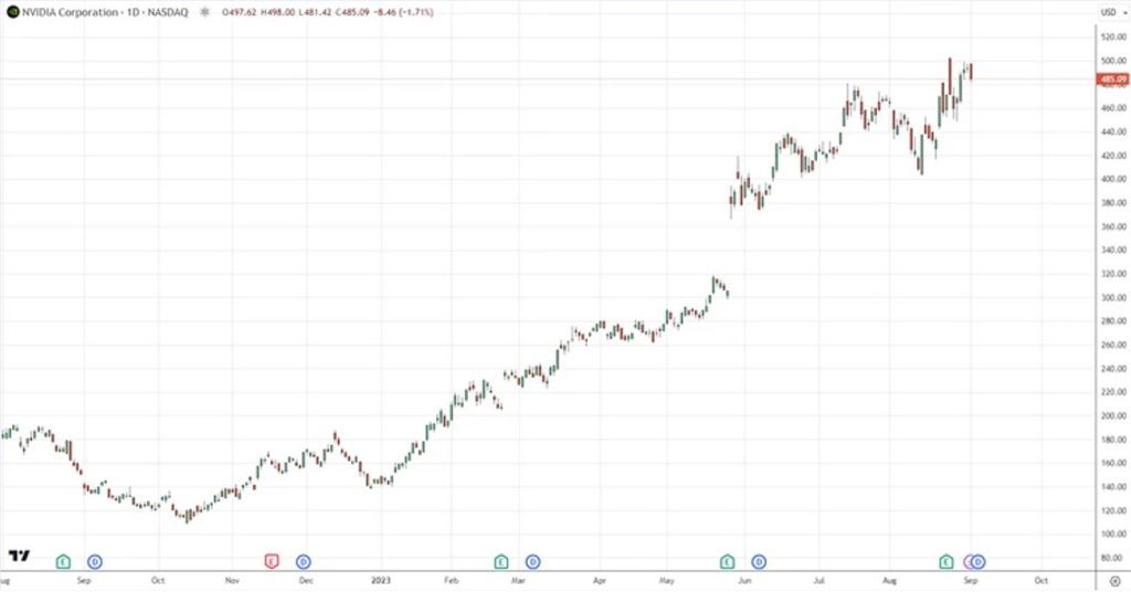 Before the publication of the quarterly report, NVIDIA shares experienced a substantial uptick. The first trading session following the release of Q2 23 ended up with an increase in the company’s stock price by 0.1%, and after the trading session’s closure, quotes decreased by 0.63%.