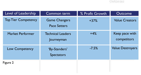 The Figure 2 below presents a top line summary of the results of the study as it relates to differing qualitative levels of organizational leadership. Clearly, top tier leadership delivers significant value creation; in contrast, weak leadership destroys value. The percentage swing approaches a 45 point differential—this substantial differential is simply not a risk most Boards would feel comfortable leaving unmonitored and unmitigated.
