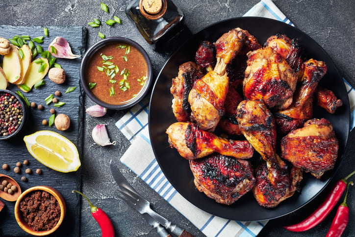 The secret lies in its seasoning – a bold blend of allspice, Scotch bonnet peppers, thyme, and other spices – rubbed generously on the chicken before it’s grilled to perfection. The result? Tender meat with a smoky crust and a fiery kick.