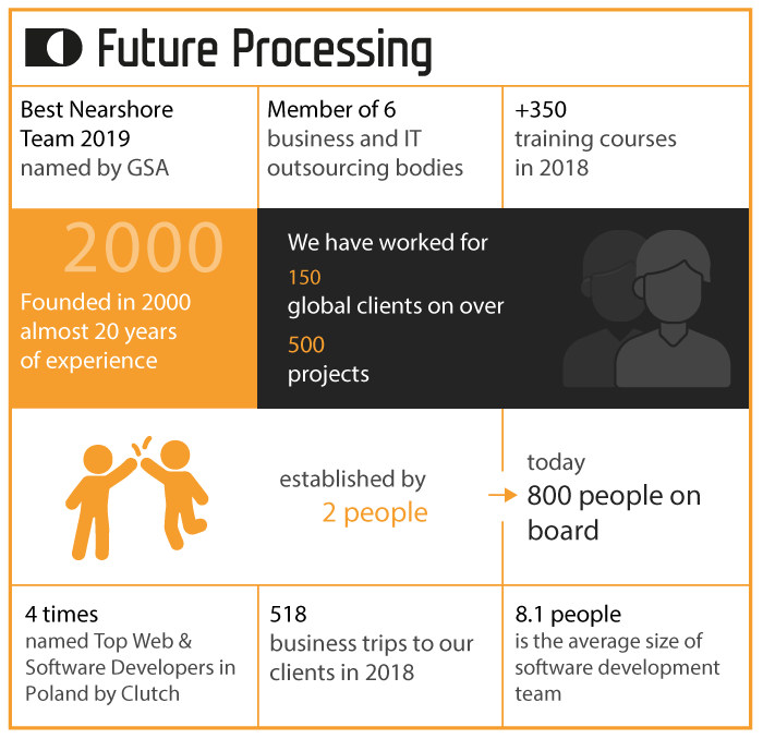 I am very happy and proud that we are being recognised by the industry. We define three fundamental values that we offer our clients: software development expertise, long-lasting partnership and being like a partner next door. Our ambition is to ask the right questions to bring our clients tangible results in the form of reliable, high-quality and sustainable software that is delivered on time, right first time. I personally think that sometimes we all forget that all those great visions, buzzwords and megatrends are nothing without reliable delivery. It’s in our DNA to be honest and transparent and communicate openly. We feel very motivated when, as a result of working with us, our clients get peace of mind from knowing that their projects are in the right hands, so they can focus on their business challenges. It is obvious to us that we will succeed only through the successes of our clients. To make our philosophy more tangible, we have created The Future Processing Way, which is our own distinct way of working, a combination of methods, tools and behaviours that helps our clients achieve great results through our partnership.