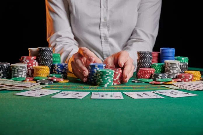 Croupier raises bets with chips. casino, playing poker in a night club, gaming business.