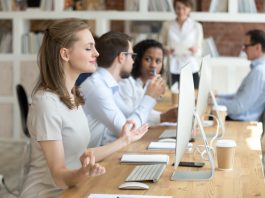 Peaceful millennial woman practice yoga in front of computer at workplace, calm female employee meditating controlling emotions and managing stress, worker sit in lotus position in office