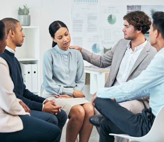 Diverse colleagues support and comfort unhappy, sad, emotional well-being coworker at team meeting or gathering. Compassionate, caring employees showing empathy to distressed woman