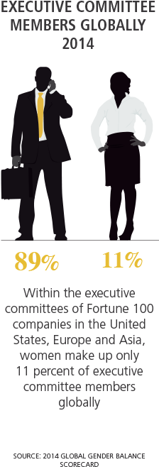 According to 20-first’s 2014 Global Gender Balance Scorecard, which examines the gender balance within the executive committees of Fortune 100 companies in the United States, Europe and Asia, women make up only 11 percent of executive committee members globally. In Europe, just 29 percent of Fortune 100 companies reported having at least two women on their executive committees. Of a total 1,025 executive committee members reported by European survey participants, only 10 percent (110) were women. None of the European companies surveyed had a female CEO.