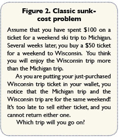 Fantino and Stolarz-Fantino also compared the ability of humans and pigeons to properly ignore “sunk costs”, unrecoverable investments that cannot influence the benefits of future decisions (see the sunk-cost example in Figure 2). Although both species were susceptible to influence by sunk costs, both were able to avoid serious blunders when the expense of essentially “throwing good money after bad” was high enough and the means of escaping this trap was clear. Other human examples of the sunk cost effect include the “Concorde fallacy” and the rationale for continued American involvement in the Vietnam war. (Solution to the vacation conundrum: go to Wisconsin!) In sum, then, decision makers are susceptible to logical errors, and humans are not always superior in avoiding them.