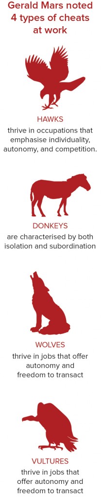Mars noted four types of cheats at work. First Hawks, who thrive in occupations that emphasise individuality, autonomy, and competition. The control that members have over others is greater than the individual’s own control. Occupations for hawks emphasise entrepreneurial behaviour, where the individual’s freedom to transact on his own terms is highly valued. Individual flair is at a premium. Success is indicated by the number of followers a person controls. Rewards here go to those who find new and better ways of doing things and where the drive for successful innovation is paramount. Hawks are individualists, inventors, small businessmen. They are hungrily ‘on the make’.