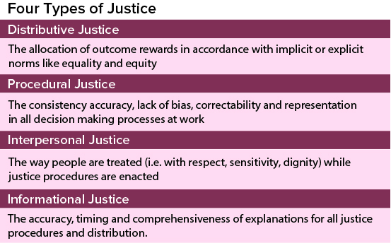 More than any other cause of ‘misbehaviour’ at work, is the issue of people feeling unfairly dealt with and taking vengeance for, or trying to restore justice in the face of injustice. Case after case of ‘insider dishonesty’ cites Fairness. Researchers in this area called Organisational Justice have, for 40 years, done research on the economic and socio-emotional consequences of perceived injustice. In doing so, they have distinguished between four related types of justice: