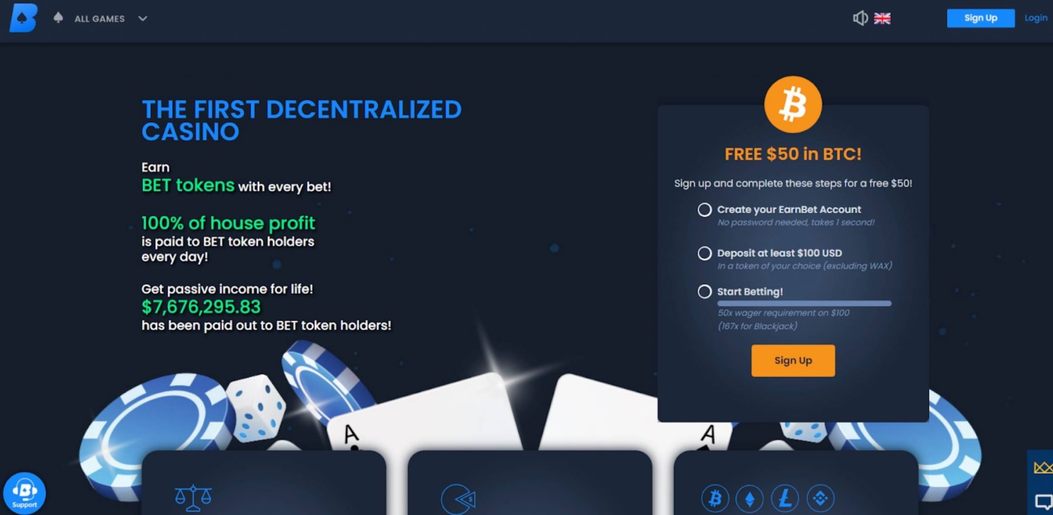 It also offers a welcome bonus of $50, which is paid out in BTC, along with the possibility of earning BET tokens with each cash bet made. These tokens allow players to eventually receive part of the profit EarnBet makes.