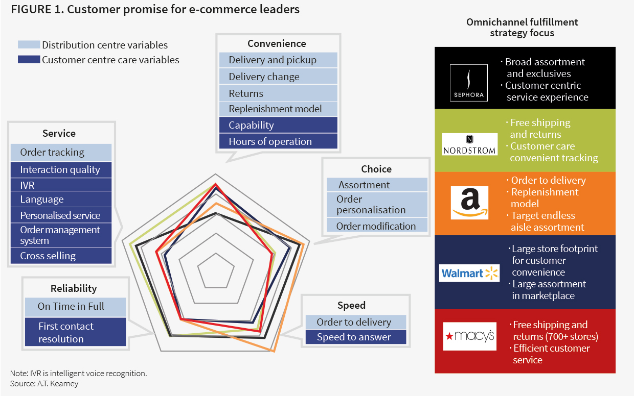 A first step to designing a winning supply chain is to define the consumer promise along five dimensions of fulfilment: choice, speed, convenience, service, and reliability. Omnichannel leaders, particularly retailers, do this well (see figure 1). Mass retailers that sell commoditised products and have relatively low basket sizes – Amazon, for example – tend to focus on a broad assortment, convenience, and speed. In contrast, specialty retailers such as Sephora – where basket sizes often exceed $75 and products are differentiated – usually focus on high customer service and a broad, personalised assortment, whereas speed tends to be less important.