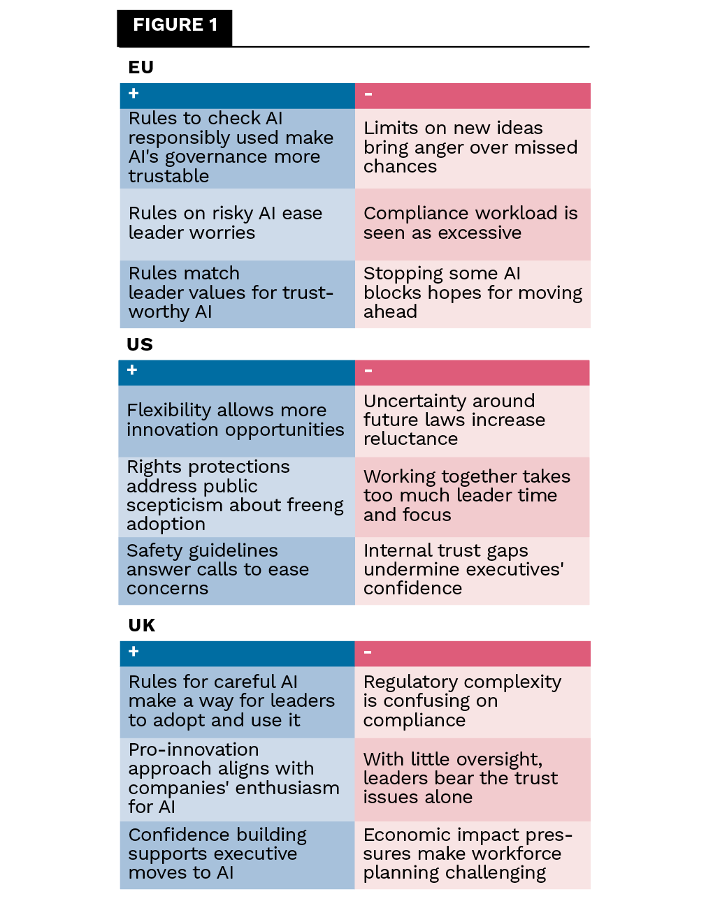As artificial intelligence becomes more embedded across sectors, governments respond with new regulations to manage risks while enabling innovation. However, complex and fragmented regulatory approaches could undermine trust in AI among key decision-makers. This analysis compares emerging AI governance laws and regulations in the EU, US, and UK, specifically examining their potential impact on trust for executives, managers, and workers adopting AI systems.