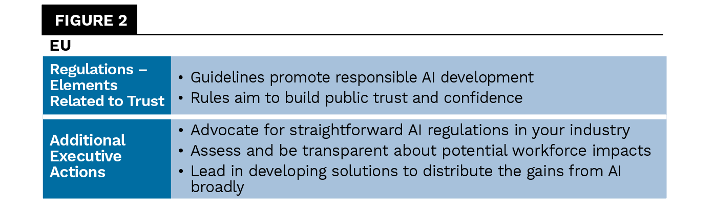 EU executives must take additional actions to build trust in AI beyond regulations due to two considerations: