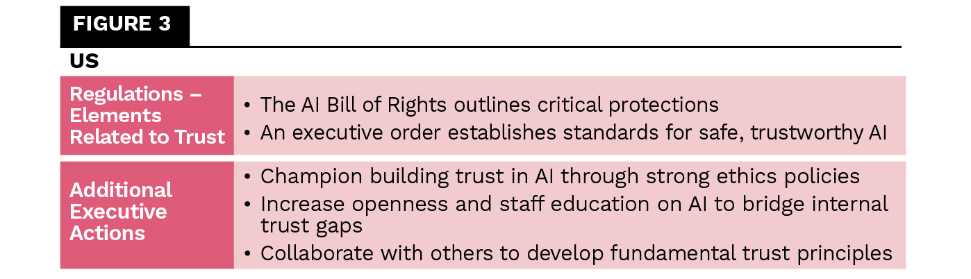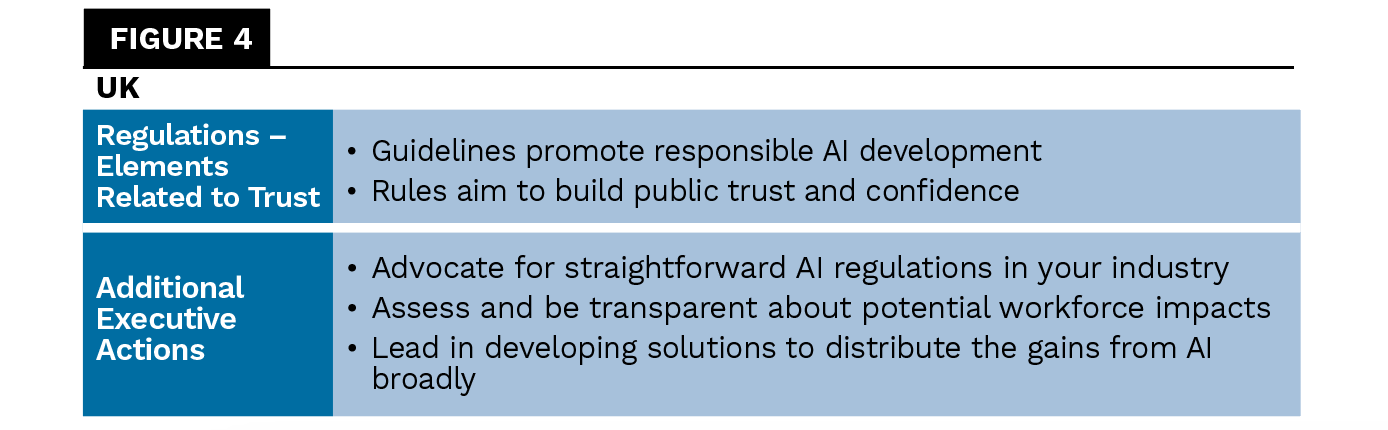 UK: In the UK, the rules want companies to feel good about using AI if it’s open on how it works and is fair. However, there are lots of complicated regulations between industries, which is confusing. This may stop executives from adopting AI. There are worries about the economic impact, too. Pros and cons mean boosting or preventing AI trust for executives.