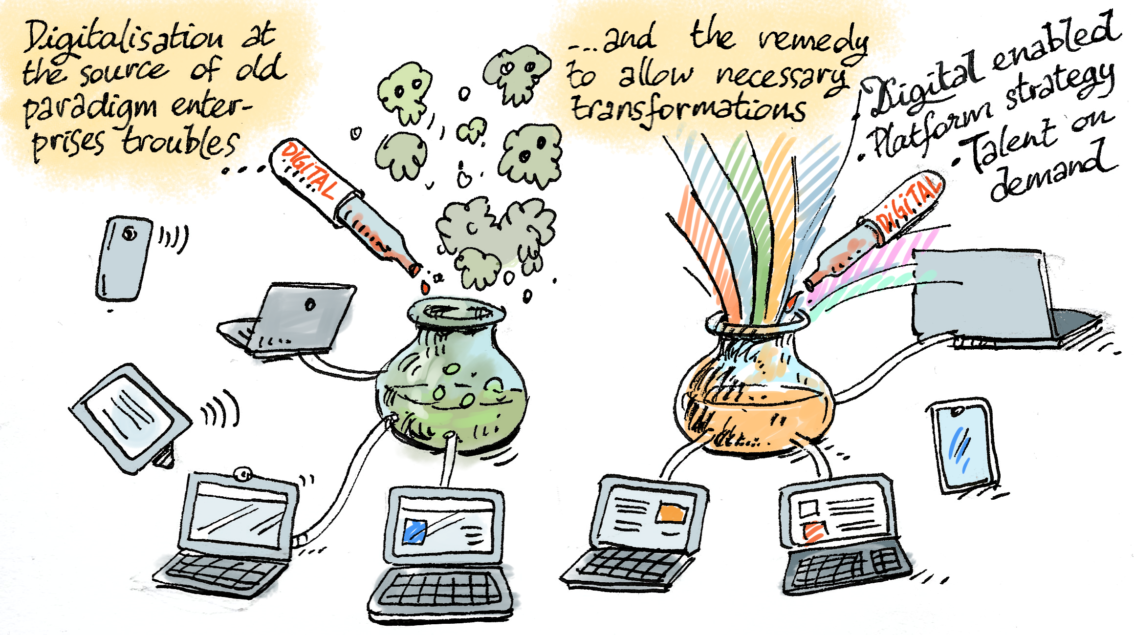 To sum it up: I see digitalisation as a pharmakon. Which is to say it is both the poison at the source of the disruptions that old-paradigm enterprises are suffering, and the remedy that allows them to transform themselves and adapt and thus live on tomorrow among the survivors. This pharmakon is creating a new form of business enterprise: the open organisation, which is identifiable via a suite of defining characteristics, including these three: Digital Enabled, Platform Strategy, and Talent on Demand.