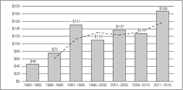 But 2017 had not been the worst year on record. That dreary distinction had belonged to 2011, when the costs of natural disasters worldwide exceeded $350 billion. Yet the long-term trend line was unmistakably upward: The inflation-adjusted cost of global calamities half-decade by half-decade had been rising, and was up more than four-fold since the early 1980s, as seen in the figure below.[1]