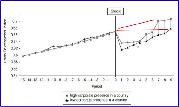 Yet for countries with a more substantial fraction of aid coming from firms with local operations, the Human Development Index rose far more rapidly after several years, restoring the country’s development trend line after seven years as if it had suffered no disaster at all, as shown by the graph’s upper arrow. Summed up, when companies are locally rooted and step forward with assistance, afflicted countries are fully back on their upward development path within little more than half a decade. But when locally-based companies fail to step-up, countries lose a decade of social development.