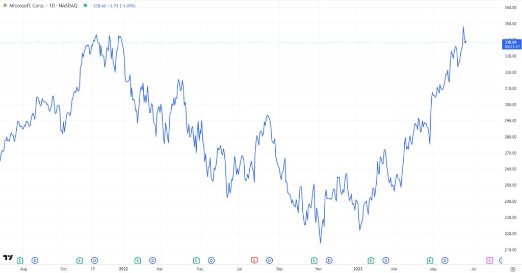 NASDAQ:MSFT (2.513T USD): Microsoft Corporation is another company that has updated its all-time high with a share price of $348. The market excitement surrounding artificial intelligence has propelled the shares of AI-related technology companies, including Microsoft stock. Its prospects for continued growth are favorable.