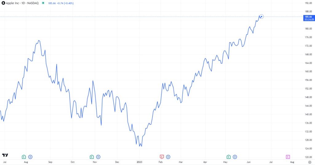 NASDAQ:AAPL (3.027T USD): Apple Inc. is experiencing active development, with the value of its shares on the rise and no apparent factors that could impede its growth.