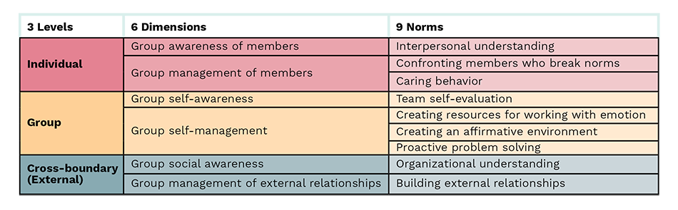 In order to evaluate and develop GEQ, three levels, six dimensions, and subsequently nine norms have to be analysed (Druskat, 2001).