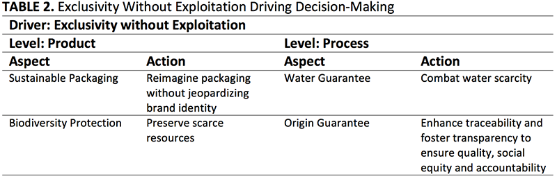 The strategic outcomes cut across the production stage and capability dimensions. For companies where innovation is the key strategic outcome, Natural Chemicals, Societal Benefits, Energy Mitigation and Community Involvement are key aspects. Where exclusivity is the focus, Sustainable Packaging, Biodiversity Protection, Water Guarantee and Origin Guarantee play a significant role. If companies are looking to support their brand image, reputation and legitimacy due to the emerging consciousness of their customers, they should focus on Unique Materials, Talent Generation, Waste Use and Total Ownership initiatives.