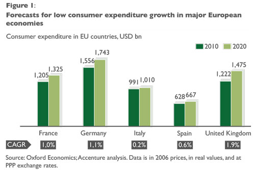 These are trying times for business leaders seeking growth in developed markets. Fewer than half the OECD economies are expected to grow by more than 1 percent in 2013. Expectations are equally dismal for consumer expenditure growth in Europe’s leading countries; especially those in Southern Europe (see Figure 1). Absolute growth in private consumption between 2010 and 2020 is now forecast to be higher in Sudan than in Italy, and higher in Chad than in Spain.