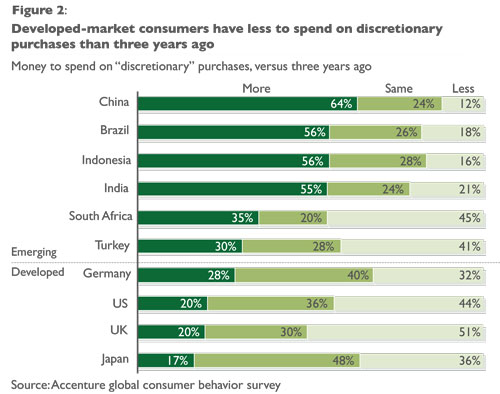 This stagnation at the level of national economies can be seen at the individual consumer level as well. As part of our study into global consumer behaviour, we surveyed 10,000 consumers from four developed and six emerging economies. Only 21 percent of developed-market consumers felt they had more money to spend on discretionary purchases than three years ago. In emerging markets, this figure was 49 percent (see Figure 2).