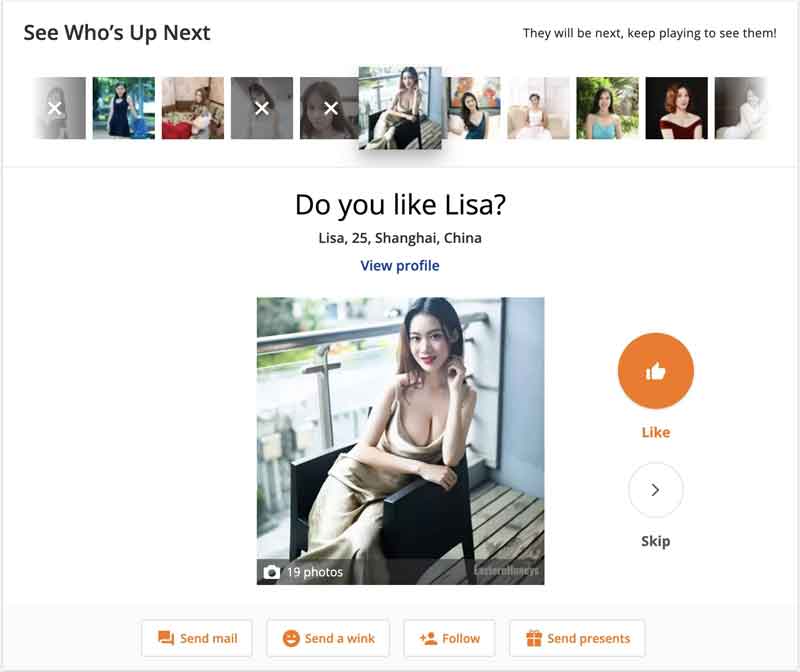 - Interactive matching game ‘People’. Playing the game, you can skip or like Asian women’s profiles that are offered randomly. We also could click ‘Send mail’, ‘Send Wink’, ‘Follow’, or ‘Send Presents’.