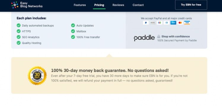 - With a 7-day free trial and 30-day money-back guarantee, you can give Easy Blog Networks a try without having to worry about wasting your hard-earned cash. If you decide that the service isn’t the right fit for you within 30 days, you can get all of your money back.