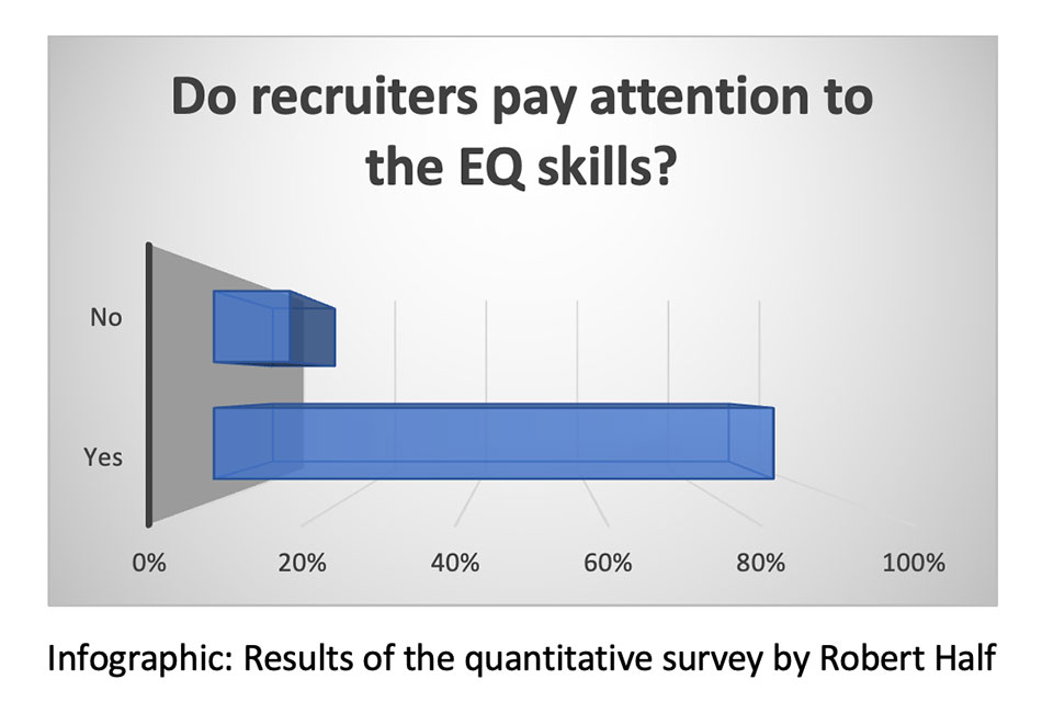 The significance of EQ skills in the workplace is shown by the recruitment company Robert Half, which recently found out through research that recruiters usually look for EQ skills in about 88 per cent of job applications, including managers and executive directors.